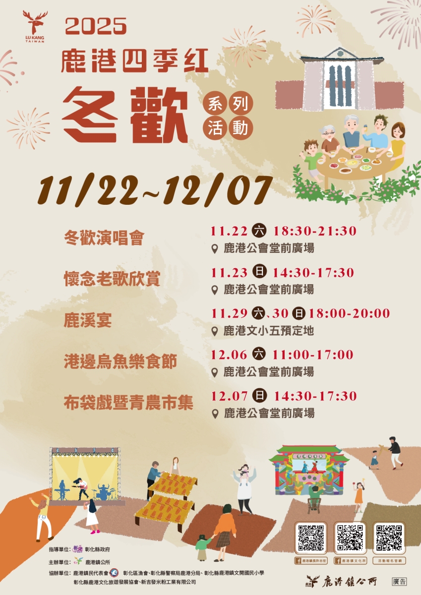 啟動拉~ 11/22(六)至12/7(日)活動精彩不間斷😍 在2025冬天~鹿港一系列有趣又歡樂的活動帶給大家,想知道相關活動請往下看下去唷!