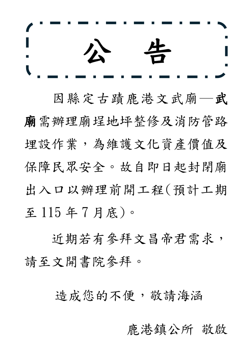 因縣定古蹟鹿港文武廟─武廟需辦理廟埕地坪整修及消防管路埋設作業,為維護文化資產價值及保障民眾安全。故自即日起封閉廟出入口以辦理前開工程(預計工期至115年7月底)。