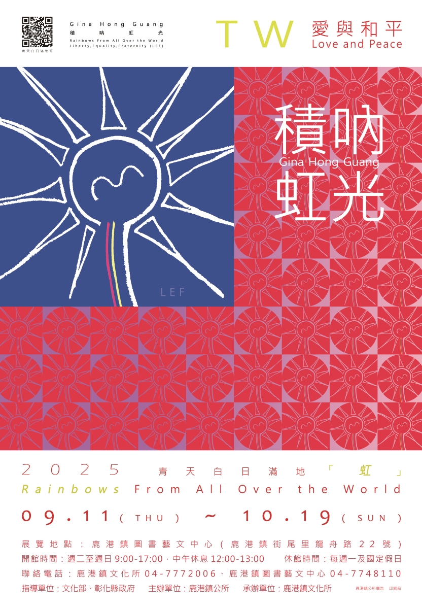為推動多元藝術發展,鹿港鎮公所自114年9月11日(四)起至10月19日(日)止,於鹿港鎮圖書藝文中心舉辦《TW|愛與和平【青天白日滿地「虹」-積吶虹光 LEF】》展覽,鎮長許志宏誠摯邀請各界藝術同好踴躍前往參觀。