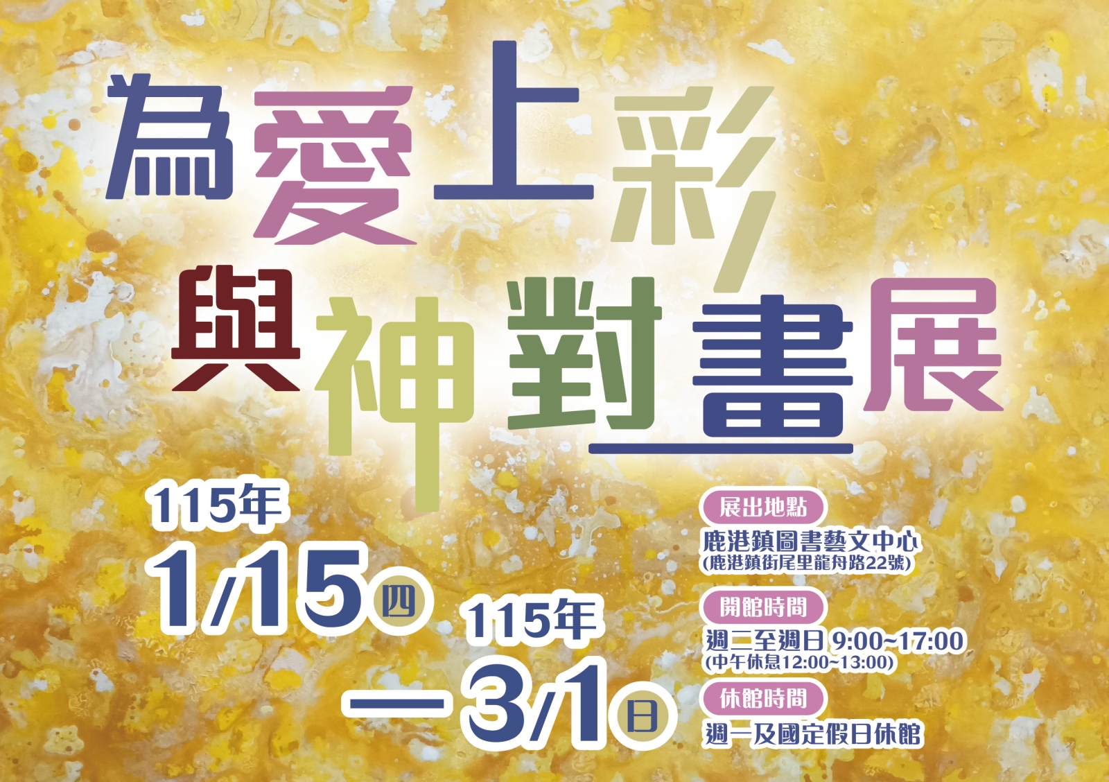鹿港鎮圖書藝文中心今年度首檔展覽「為愛上彩-與神對畫展」今(15日)正式亮相,展期自115年1月15日至3月1日止。本次展覽透過藝術療癒與直覺創作,引領觀者走入內在心靈世界,展開一場自我與畫作、亦與神聖意識的深層對話,鹿港鎮長許志宏誠摯邀請民眾前來觀展,共同感受藝術所帶來的療癒力量與精神啟發。