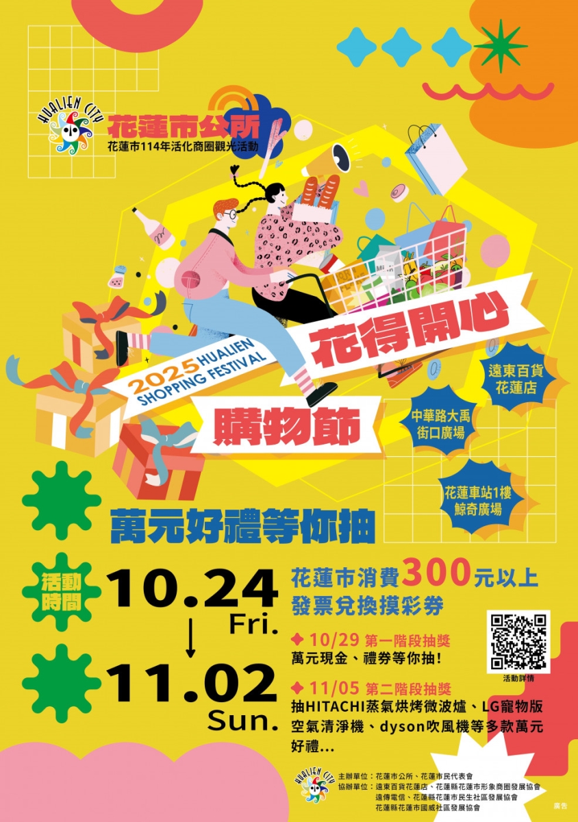 活動自114年10月1日起至114年11月2日止,祭出於花蓮市購物單筆消費300元以上發票,消費登錄即可兌換摸彩券,活動詳情請上