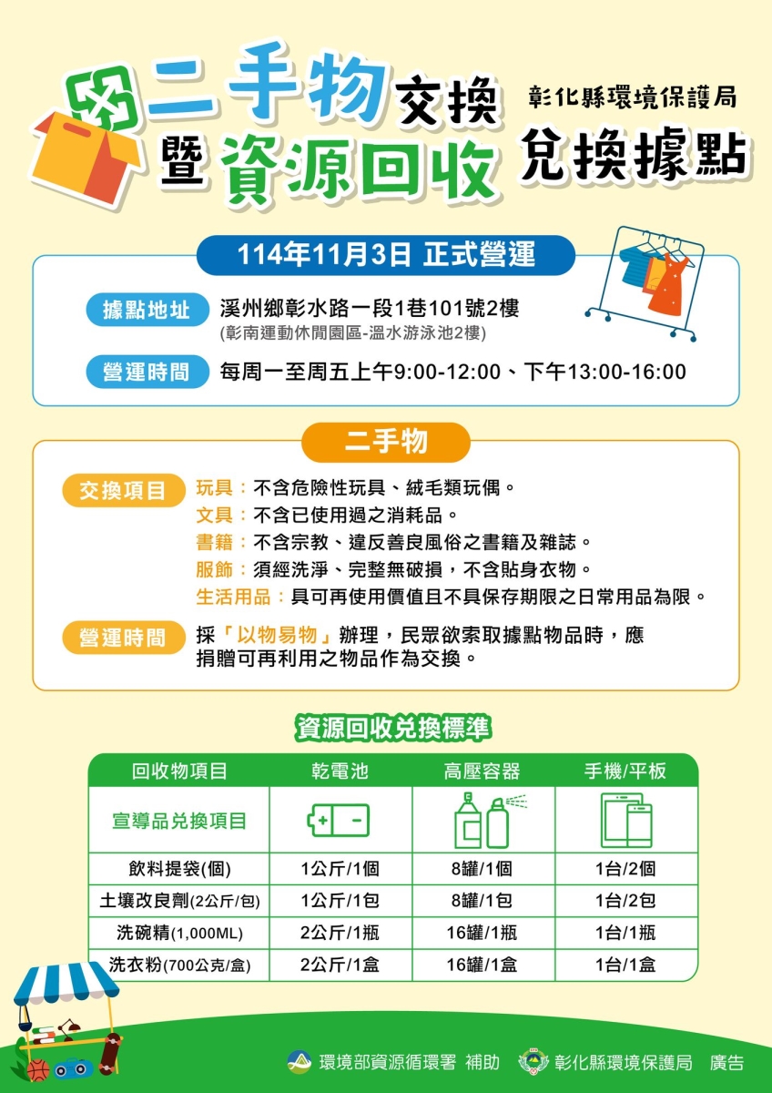 轉知--彰化縣環境保護局自114年11月3日起於彰南運動休閒園區設置「不用品(堪用品)交換據點」
