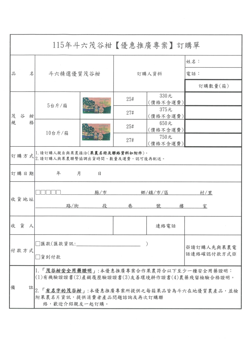 雲林縣斗六市公所檢送「115年斗六茂谷柑」優惠推廣專案訂購資料1份