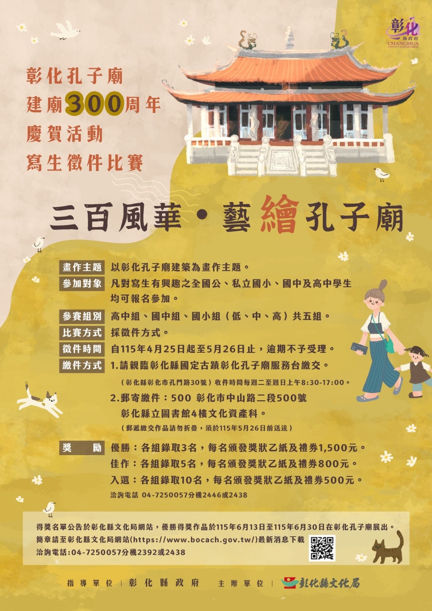 轉知~彰化縣文化局「三百風華・藝繪孔子廟」彰化孔子廟建廟300周年慶賀活動寫生徵件比賽